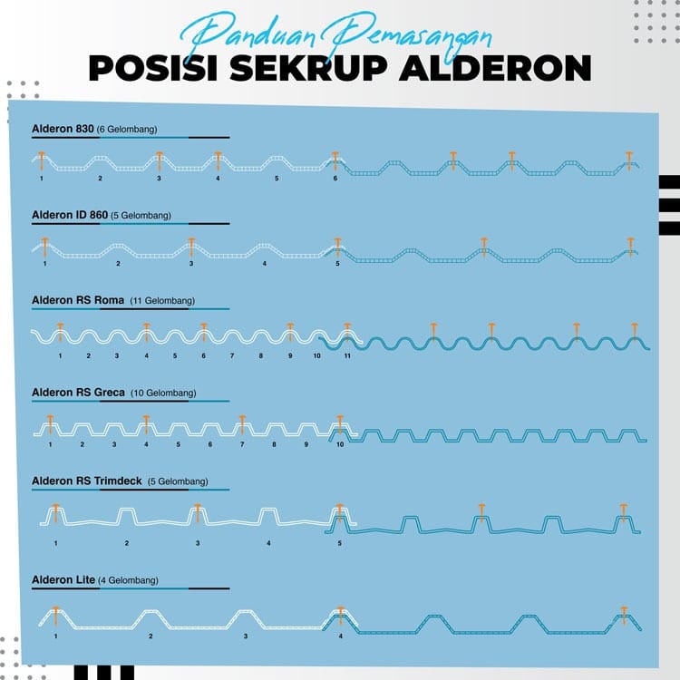 2.Gunakan Sekrup Khusus Alderon Weather Seal Anda harus menggunakan sekrup khusus yang tersedia untuk atap Alderon yaitu Alderon Weather Seal. Alderon Weather Seal berkepala dan dilengkapi dengan karet pelindung. Buat diameter lubang sekrup dibuat lebih besar dari diameter sekrup kira-kira 3 mm untuk ruang pemuaian karena adanya perbedaan suhu antara siang dan malam. Pemasangan sekrup harus dalam satu gunungan yang sama dan sekrup harus sejajar dalam satu barisan ke belakang.